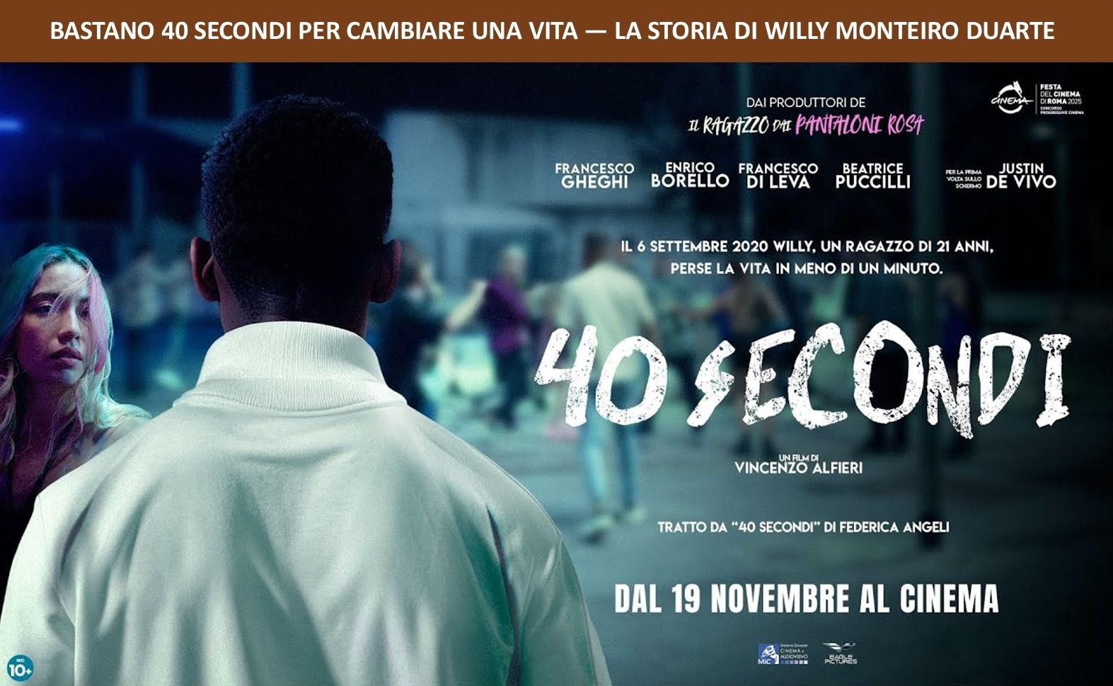 40 Secondi, il film diretto da Vincenzo Alfieri, sarà sullo schermo del VIP da giovedì 20 novembre: si ispira a una vicenda reale di ingiustizia e disumanità che ha sconvolto l’Italia. L’omicidio di Willy Monteiro Duarte (Justin De Vivo), un ragazzo capoverdiano di soli ventuno anni, brutalmente aggredito e ucciso a mani nude nella notte tra il 5 e il 6 settembre 2020 a Colleferro, in provincia di Roma.
