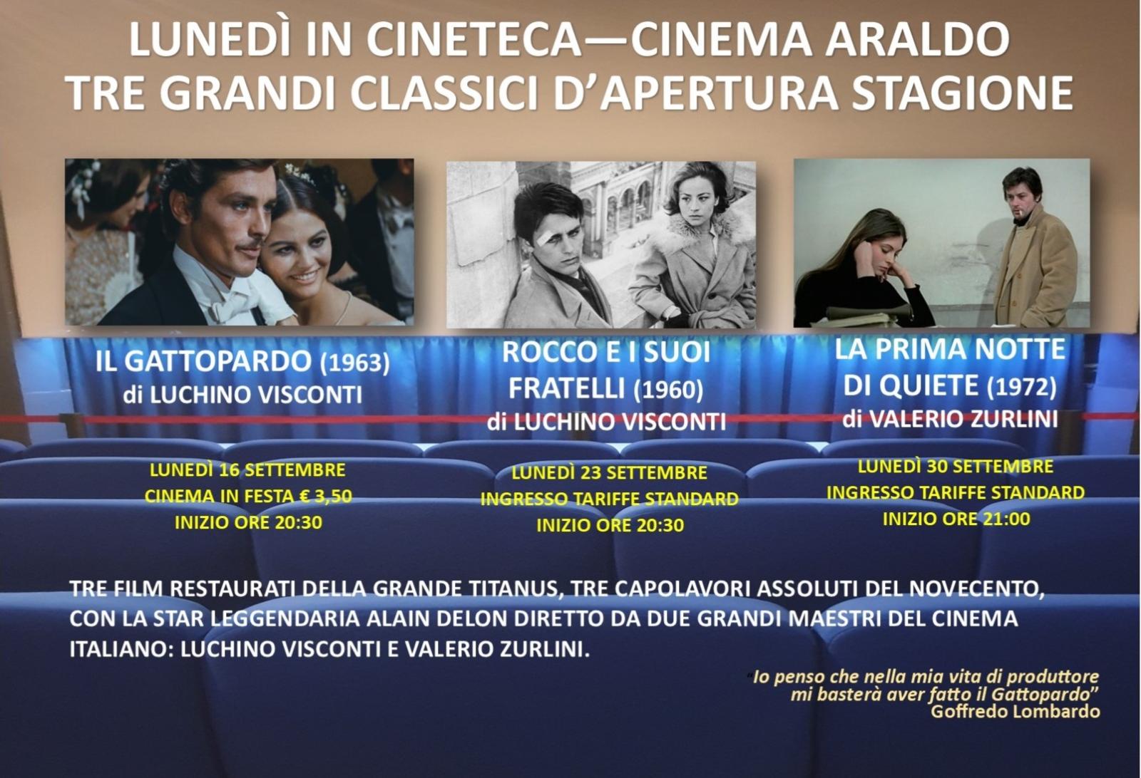 A settembre l'Araldo, nell'ambito della sezione Cineteca celebra il leggendario Alain Delon diretto da due grandi maestri del cinema italiano. Tre film prodotti dalla mitica Titanus, casa cinematografica fondata a Napoli nel 1904 da Gustavo lombardo e portata all'apice del successo dal figlio Goffredo Lombardo. I film in programma saranno IL GATTOPARDO (1963) di Luchino Visconti (Lunedì 16 settembre); ROCCO E I SUOI FRATELLI (1960) di Luchino Visconti (Lunedì 23 settembre); LA PRIMA NOTTE DI QUIETE (1972) di Valerio Zurlini (Lunedì 30 settembre).